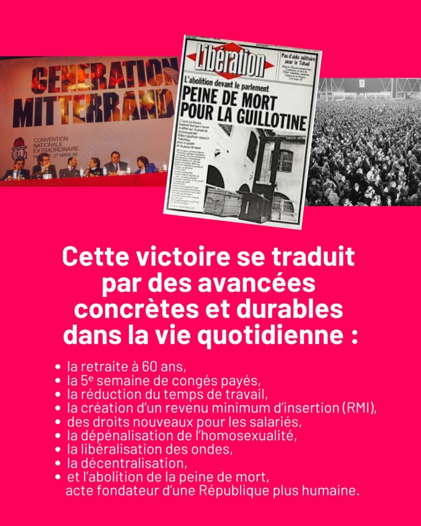De 1981 aux grandes réformes qui ont marqué durablement le pays comme la retraite à 60 ans, les nouveaux droits sociaux, la décentralisation, les libertés publiques renforcées, l’abolition de la peine de mort, la gauche a montré qu’elle pouvait changer la vie des gens.