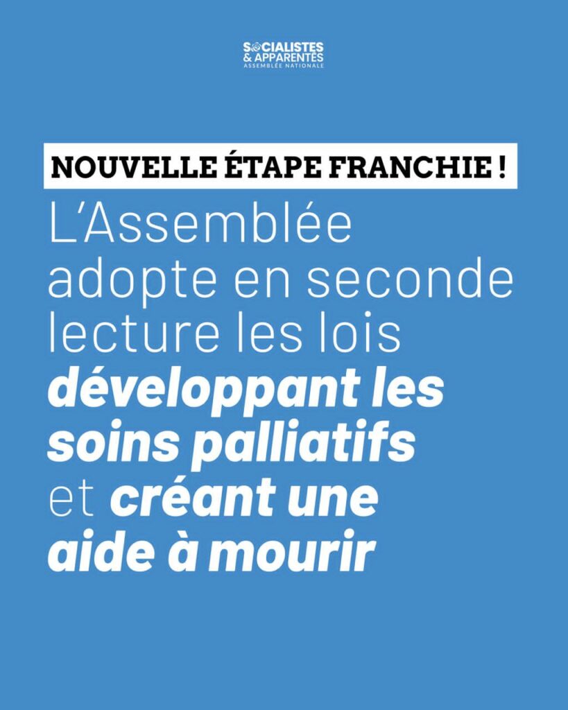 L’Assemblée nationale a adopté en seconde lecture deux textes importants, l’un pour développer les soins palliatifs et l’autre créant une aide à mourir. J’ai voté en faveur de ces deux textes qui constituent une avancée historique pour notre pays. Deux textes de liberté, qui encadrent très strictement un nouveau droit à mourir pour des patients…